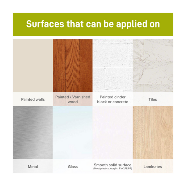 Works on a variety of surfaces, such as painted Gyprock, finished wood, tile, metal and glass