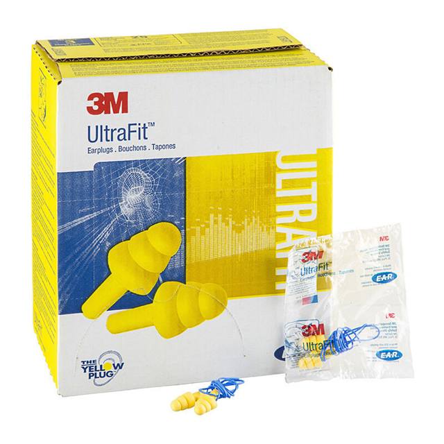 The 3M E-A-R Ultrafit Earplugs 340-4004 Cord Pair are reusable, corded earplugs featuring a triple-flange design made of a soft, pliable polymer that provides comfortable, push-to-fit noise reduction in a single size