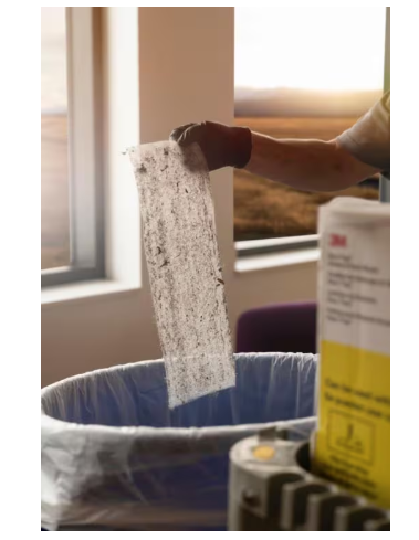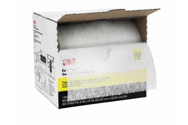 3M Easy Trap Sweep & Dust Sheets are a disposable, perforated roll of tacky sheets, 12.7 cm by 15.24 cm, designed to efficiently trap and hold dirt, dust, sand, and hair from floors and other surfaces using a light adhesive