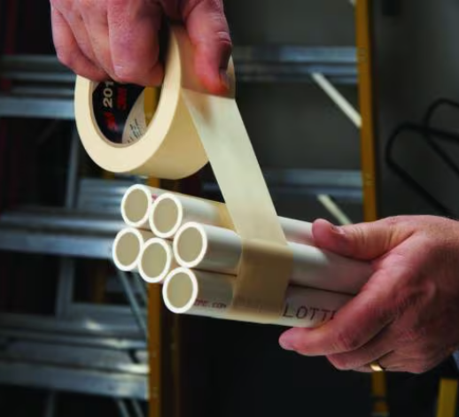 3M General Use Masking Tape 201+ Tan 18mmX55M is a versatile, hand-tear able crepe paper tape designed for light to medium-duty indoor applications, such as bundling, labelling, and temporary marking