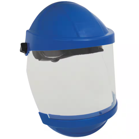 The 3M VC107 Visor Ratchet Polycarbonate High Impact Blue is an Australian-made face shield featuring a blue browguard, a wide-flare 1mm polycarbonate visor for high impact and liquid protection, and a blue chinguard for added face and neck coverage