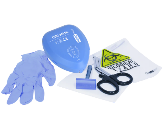 Comprised of high-grade emergency medical supplies, this premium AED prep kit also contains a hazardous waste disposal bag, and a hard-cased CPR mask with an oxygen port, in the event oxygen is to be administered