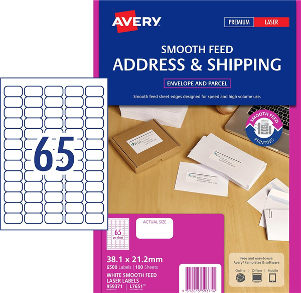 Dimensions: 38.1 x 21.2 mm|Content: 6500 Labels / 100 Sheets|Printer Type: Laser|Software Code: L7651|Adhesive Type: Permanent|Colour: White|Made From: Paper|Format: A4|Eco-friendly: FSC