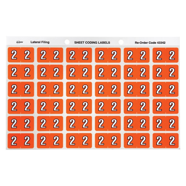 There are 180 orange Numeric 2 Side Tab Colour Coding Labels in a pack with a size of 25 x 38mm ready to stick straight onto the side tab of your Avery Lateral Files.