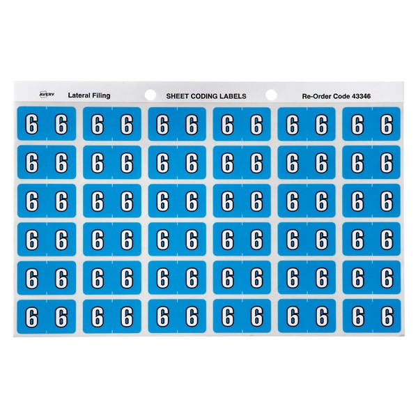 There are 180 blue Numeric 6 Side Tab Colour Coding Labels in a pack with a size of 25 x 38mm ready to stick straight onto the side tab of your Avery Lateral Files.