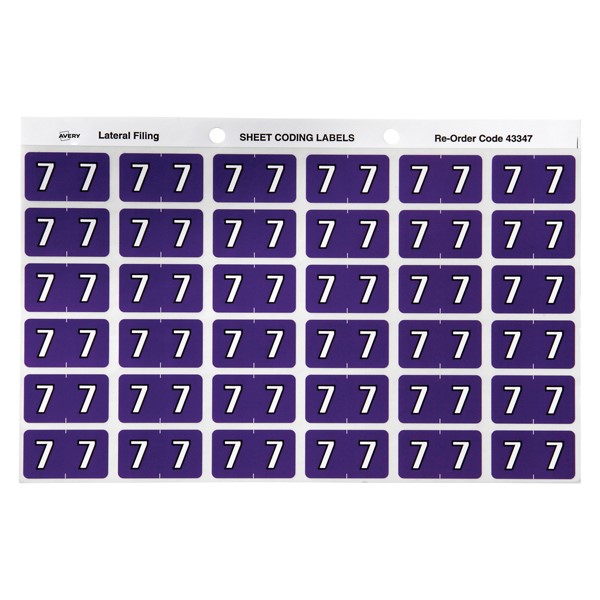 There are 180 purple Numeric 7 Side Tab Colour Coding Labels in a pack with a size of 25 x 38mm ready to stick straight onto the side tab of your Avery Lateral Files.