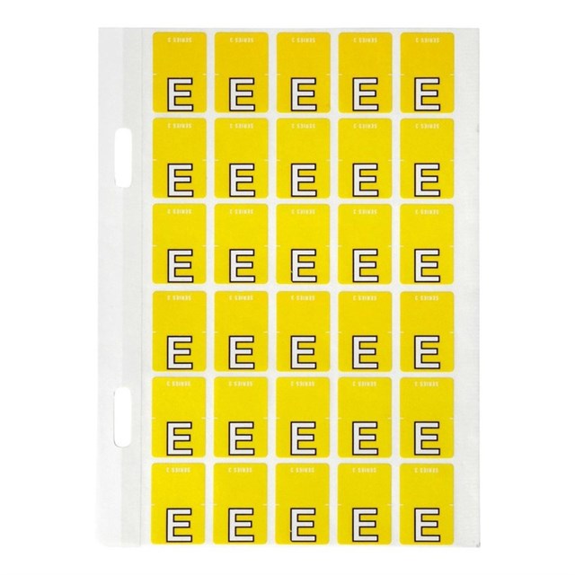 There are 150 yellow Alphabetical ‘E’ Top Tab Colour Coding Labels in a pack with a size of 20 x 30mm ready to stick straight onto your top tab of any Twin Tab Lateral Files including QuickVue™ files