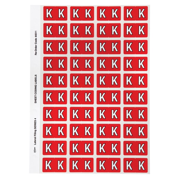There are 240 red Alphabetical K Side Tab Colour Coding Labels in a pack, size of 25 x 42mm ready to stick straight onto the side tab of your Avery Lateral Files.