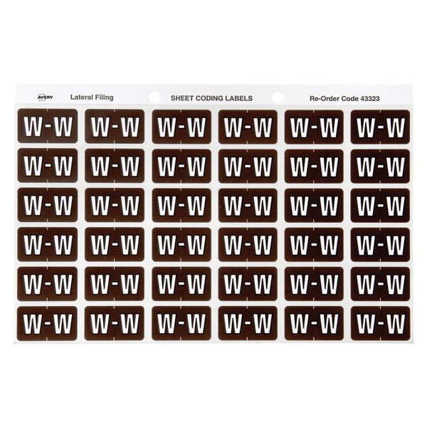 There are 180 brown Alphabetical W Side Tab Colour Coding Labels in a pack with a size of 25mm x 38mm ready to stick straight onto the side tab of your Avery Lateral Files.