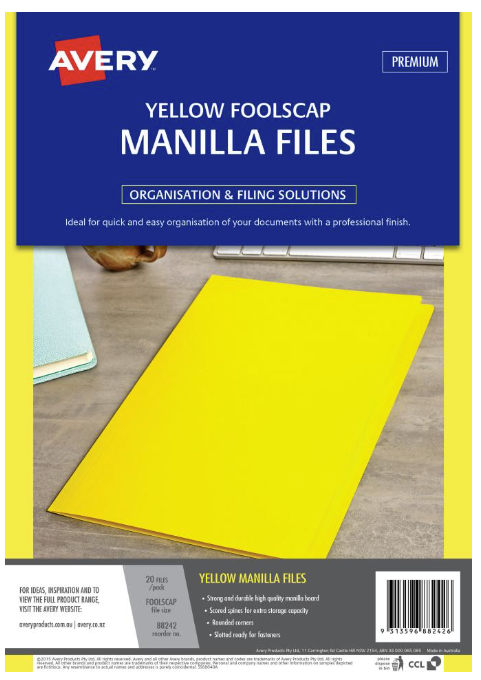 Avery Folder Manilla Foolscap Yellow 20 Pack Adelaide Direct Stationers
