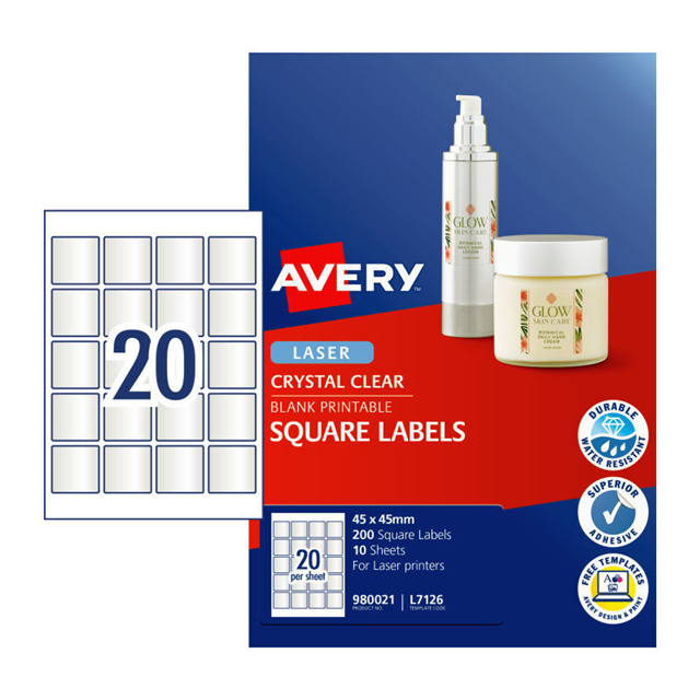 Avery Laser Label Square Clear L7126 45x45mm 20Up Pk20 are 100% transparent, making it appear as if your logo has been directly printed onto your products and packaging