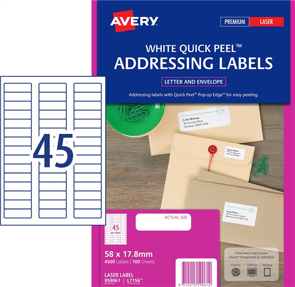 The label format is 58 x 17.8mm with 45 labels per sheet and is an ideal size for applying to DL envelopes