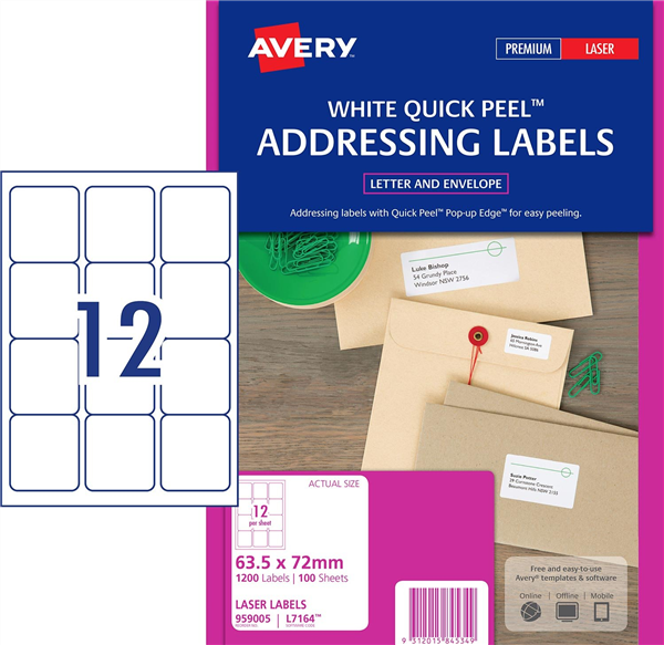 The label format is 63.5 x 72mm with 12 labels per sheet and is an ideal size for applying to DL envelopes
