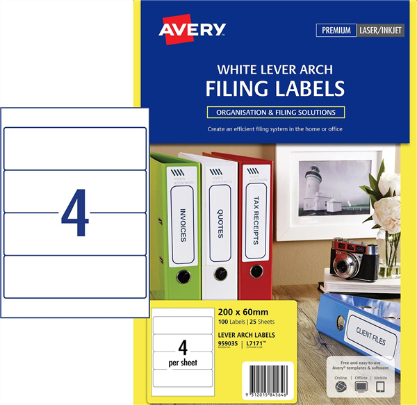 Avery Laser Labels Lever Arch 4UP White 25 Pack Adelaide Direct Stationers