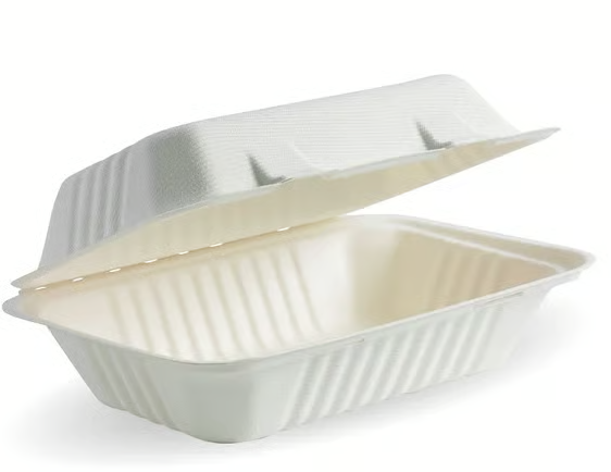Our 9x6x3" white bagasse clamshell containers are an eco-friendly alternative to plastic takeaway containers.
