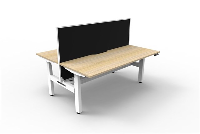 Boost Plus Back To Back Workstation With Screen - Natural Oak/ White Satin 1800mm W x 1500mm D x 620mm - 1270mm H (Overall) 1800mm W x 750mm D x 620mm - 1270mm H (Per User) Overall Height AFFL including Screen: 1330mm H E0 Rated 25mm T Table Top Finished In Natural Oak With Rigid Edging & 50mm D Scallop Cut Out To Rear Underframe Finished In White Satin Powder Coat Fully Ducted Cable Tray With Punchout For Power & Data To be Fitted To Either External Or Internal Of Frame 1800mm W x 900mm H x 30mm T Pinnable Privacy Screen Finished In Black Fabric With Matching White P/C Extrusion Digital Control Panel With 3 Pre-Set Positions LED Display Panel Keypad Safety Lock & Reminder Alarm Setting Anti- Collision & Anti-Tilt Technology Column Size: 90mm x 60mm Height Range: 595mm-1245mm ( Without Table Top ) Lifting Capacity: 120 Kg Max Speed: 38mm Per Second Adjustable Leveling Feet Dual Motor Desk Mounting Top Plate Size: 500mm Steel Gauge: 3.0mm, 2.0mm & 1.5mm Used Throughout Noise Emission: <50DB Surge Immunity: 1kV(L1 to L2) / 2kV(L1,L2 To PE) ESD Protection: +-4.0kV ( Contact Discharge )/+-8.0kV ( Air Discharge ) Input Power: 110-240V Transformer Power:128W (.03W On Standby ) SAA and C Tick Certification Additional Items Also Available Include: Bluetooth Control Box ( B2-BTCB ) Cable Tray Bridge ( B2-B2BBR ) Flexible Cable Snake ( B2-CBSNAKE ) Battery Pack ( B2-BATT ) AFRDI CERTIFIED 10 Year Warranty