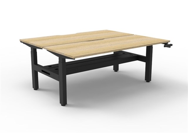 Boost Crank Manual Height Adjustable Back To Back Workstation - Natural Oak/ Black Satin 1500mm W x 1500mm D x 705mm - 1155mm H (Overall) 1500mm W x 750mm D x 705mm - 1155mm H (Per User) E0 Rated 25mm T Table Top Finished In Natural Oak With Rigid Edging & 50mm D Scallop Cut Out To Rear Underframe Finished In Black Satin Powder Coat Fully Ducted Cable Tray With Punchout For Power & Data To be Fitted To Either External Or Internal Of Frame Column Size: 90mm x 60mm Frame Height: 680mm - 1130mm Max Speed: 15mm Per Second ( 10mm Per Full Turn Circle ) Adjustable Leveling Feet Desk Mounting Top Plate Size: 500mm Steel Gauge: 3.0mm, 2.0mm & 1.5mm Used Throughout Additional Items Also Available Include: 30mm T Pinnable Privacy Screen ( SHS159 + B2-BBRAC ) Cable Tray Bridge ( B2-SSBR ) Flexible Cable Snake ( B2-CBSNAKE ) 10 Year Warranty