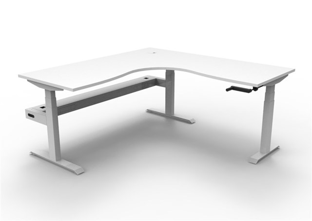 Boost Crank Manual Height Adjustable Corner Workstation - Natural White/ White Satin 1800mm W x 1800mm W x 750mm D x 705mm - 1155mm H E0 Rated 25mm T Table Top Finished In Natural White With Rigid Edging & 80mm Dia Cable Entry With Cover Underframe Finished In White Satin Powder Coat Fully Ducted Cable Tray With Punchout For Power & Data To be Fitted To Either External Or Internal Of Frame Column Size: 90mm x 60mm Foot Size: 700mm Of Main Desk + 500mm For Return Frame Frame Height: 680mm - 1130mm Max Speed: 15mm Per Second ( 10mm Per Full Turn Circle ) Adjustable Leveling Feet Desk Mounting Top Plate Size: 500mm Steel Gauge: 3.0mm, 2.0mm & 1.5mm Used Throughout Additional Items Also Available Include: 30mm T Pinnable Privacy Screen ( SHS189 + B2-SSARM + B2-SBRAC ) Cable Tray Bridge ( B2-SSBR ) Flexible Cable Snake ( B2-CBSNAKE ) 10 Year Warranty