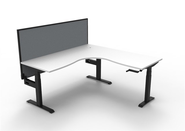 Boost Crank Manual Height Adjustable Corner Workstation - Natural White/ Black Satin 1800mm W x 1800mm W x 750mm D x 705mm - 1155mm H E0 Rated 25mm T Table Top Finished In Natural White With Rigid Edging & 80mm Dia Cable Entry With Cover Underframe Finished In Black Satin Powder Coat 1800mm W x 900mm H x 30mm T Pinnable Privacy Screen Finished In Grey Fabric With Matching Black P/C Extrusion Column Size: 90mm x 60mm Foot Size: 700mm Of Main Desk + 500mm For Return Frame Frame Height: 680mm - 1130mm Max Speed: 15mm Per Second ( 10mm Per Full Turn Circle ) Adjustable Leveling Feet Desk Mounting Top Plate Size: 500mm Steel Gauge: 3.0mm, 2.0mm & 1.5mm Used Throughout Additional Items Also Available Include: Fully Ducted Cable Tray Complete With Power & Data Punchouts Internal & External To Tray ( B2-SSCT18 ) Cable Tray Bridge ( B2-SSBR ) Flexible Cable Snake ( B2-CBSNAKE ) 10 Year Warranty