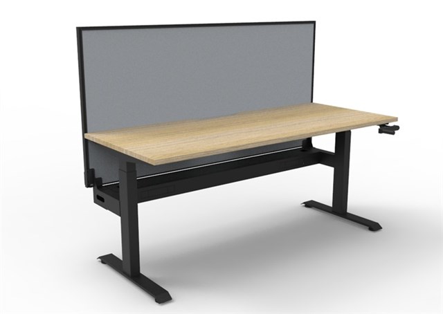 Boost Crank Manual Height Adjustable Single Sided Workstation With Screen - Natural Oak/ Black Satin 1200mm W x 750mm D x 705mm - 1155mm H Overall Height AFFL including Screen: 1330mm H E0 Rated 25mm T Table Top Finished In Natural Oak With Rigid Edging & 50mm D Scallop Cut Out To Rear Underframe Finished In Black Satin Powder Coat Fully Ducted Cable Tray With Punchout For Power & Data To be Fitted To Either External Or Internal Of Frame 1200mm W x 900mm H x 30mm T Pinnable Privacy Screen Finished In Grey Fabric With Matching Black P/C Extrusion Column Size: 90mm x 60mm Frame Height: 680mm - 1130mm Max Speed: 15mm Per Second ( 10mm Per Full Turn Circle ) Adjustable Leveling Feet Foot Size: 700mm Desk Mounting Top Plate Size: 500mm Steel Gauge: 3.0mm, 2.0mm & 1.5mm Used Throughout Additional Items Also Available Include: Cable Tray Bridge ( B2-SSBR ) Flexible Cable Snake ( B2-CBSNAKE ) 10 Year Warranty