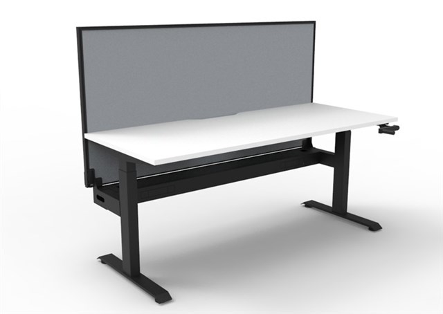 Boost Crank Manual Height Adjustable Single Sided Workstation With Screen - Natural White/ Black Satin 1800mm W x 750mm D x 705mm - 1155mm H Overall Height AFFL including Screen: 1330mm H E0 Rated 25mm T Table Top Finished In Natural White With Rigid Edging & 50mm D Scallop Cut Out To Rear Underframe Finished In Black Satin Powder Coat Fully Ducted Cable Tray With Punchout For Power & Data To be Fitted To Either External Or Internal Of Frame 1800mm W x 900mm H x 30mm T Pinnable Privacy Screen Finished In Grey Fabric With Matching Black P/C Extrusion Column Size: 90mm x 60mm Frame Height: 680mm - 1130mm Max Speed: 15mm Per Second ( 10mm Per Full Turn Circle ) Adjustable Leveling Feet Foot Size: 700mm Desk Mounting Top Plate Size: 500mm Steel Gauge: 3.0mm, 2.0mm & 1.5mm Used Throughout Additional Items Also Available Include: Cable Tray Bridge ( B2-SSBR ) Flexible Cable Snake ( B2-CBSNAKE ) 10 Year Warranty