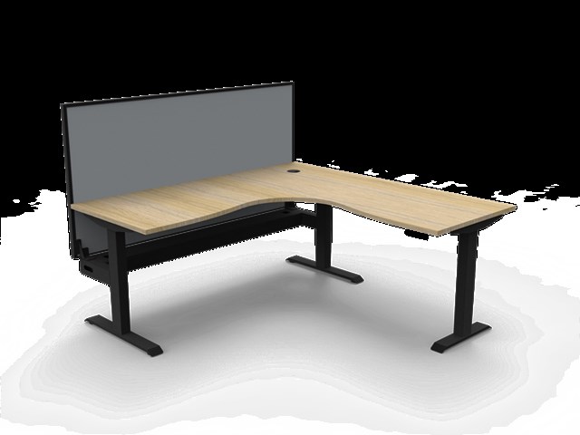 Boost Static Corner Workstation - Natural Oak/ Black Satin 1800mm W x 1800mm W x 750mm D x 730mm H E0 Rated 25mm T Table Top Finished In Natural Oak With Rigid Edging & 80mm Dia Cable Entry With Cover Underframe Finished In Black Satin Powder Coat Fully Ducted Cable Tray With Punchout For Power & Data To be Fitted To Either External Or Internal Of Frame 1800mm W x 900mm H x 30mm T Pinnable Privacy Screen Finished In Grey Fabric With Matching Black P/C Extrusion Column Size: 90mm x 60mm Frame Height: 705mm ( Without Table Top ) Adjustable Leveling Feet Foot Size: 700mm Of Main Desk + 500mm For Return Frame Desk Mounting Top Plate Size: 500mm Steel Gauge: 3.0mm, 2.0mm & 1.5mm Used Throughout Additional Items Also Available Include: Cable Tray Bridge ( B2-SSBR ) Flexible Cable Snake ( B2-CBSNAKE ) 10 Year Warranty