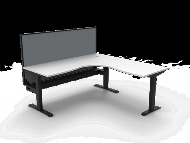 Boost Static Corner Workstation - Natural White/ Black Satin 1800mm W x 1800mm W x 750mm D x 730mm H E0 Rated 25mm T Table Top Finished In Natural White With Rigid Edging & 80mm Dia Cable Entry With Cover Underframe Finished In Black Satin Powder Coat Fully Ducted Cable Tray With Punchout For Power & Data To be Fitted To Either External Or Internal Of Frame 1800mm W x 900mm H x 30mm T Pinnable Privacy Screen Finished In Grey Fabric With Matching Black P/C Extrusion Column Size: 90mm x 60mm Frame Height: 705mm ( Without Table Top ) Adjustable Leveling Feet Foot Size: 700mm Of Main Desk + 500mm For Return Frame Desk Mounting Top Plate Size: 500mm Steel Gauge: 3.0mm, 2.0mm & 1.5mm Used Throughout Additional Items Also Available Include: Cable Tray Bridge ( B2-SSBR ) Flexible Cable Snake ( B2-CBSNAKE ) 10 Year Warranty