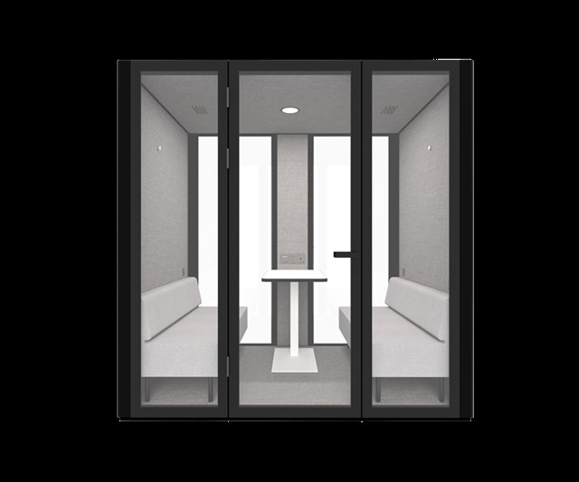 B.Quiet 2-4 Person Acoustic Meeting Pod Overall Size: 2245mm H x 2200mm W x 1200mm D Internal Size: 2165mm H x 2080mm W x 1080mm D Exterior Finish - Black Powder Coat Interior Finish GP18 Dark Grey Eco Panel Desktop Finish: Black Melamine ( 2 x 50mm Radial Corners ) Table Base Finish: Black P/C Sofa Finish: 1333 Light Grey Fabric + 30mm Black P/C Tube Legs Carpet Finish: Dark Grey 45mm Hidden Frame Glass Door, 10mm Safety Glass To Rear & 6mm Safety Glass To Door Finished With Black Silkscreen Print - Black P/C German Door Ware - 3 x Heavy Duty Stainless Steel Hinges Speech Level Reduction: 30DB Sofas (x2) Per POD: 1070mm W x 580mm D x 680mm H ( Overall ) 390mm Seat Height 450mm Seat Depth 290mm Back Rest Height Table: 500mm W x 700mm W x 680mm H - Rectangular Flat Plate Base Underframe ( 2 x 50mm Radius Corners ) Doorway Width: 840mm Acoustic Pod is Fitted With 1 x LED Light 4w 4000k - 4 x Ventilation Fans Power Point: Hager Allure WBHP2SUSBAC-MB - 10Amp Double Internal Power Point With USB A+C Charger - Matte Black Bottom Of The Pod Has Been Fitted With Heavy Duty Castors For Easy Of Movement When Relocating