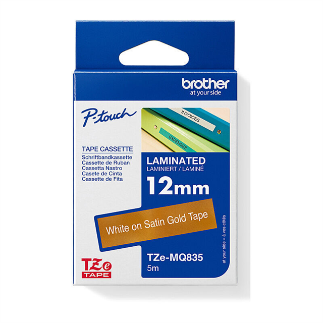 Brother TZeMQ835 Labelling Tape 12mmx5m White on Satin Gold Adelaide Direct Stationers