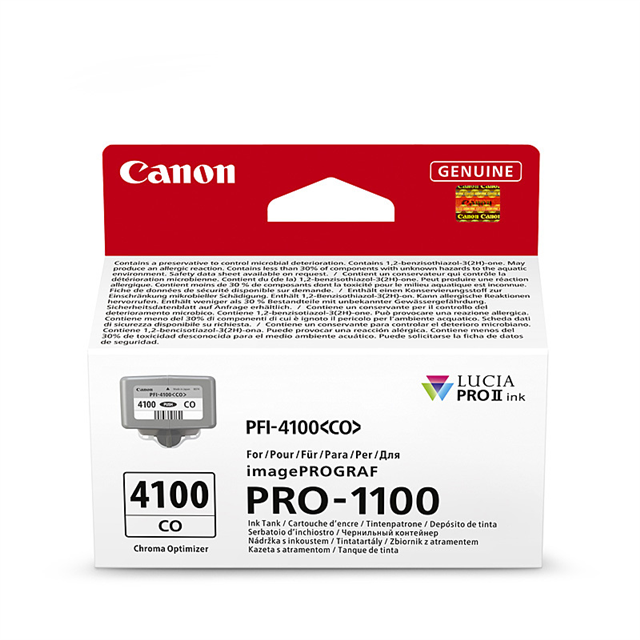 The Canon PFI-4100 Chroma Optimizer (CO) ink tank contains 80mL of specialized clear pigment ink, designed to work with the Canon imagePROGRAF PRO-1100 printer