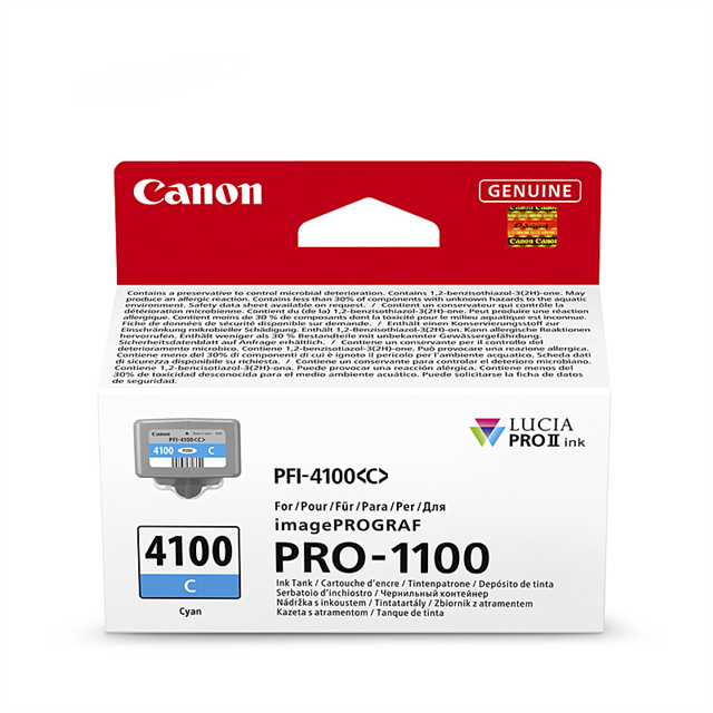 The Canon PFI-4100 Cyan (C) ink tank contains 80mL of genuine LUCIA PRO II pigment ink, exclusively designed for the Canon imagePROGRAF PRO-1100 printer