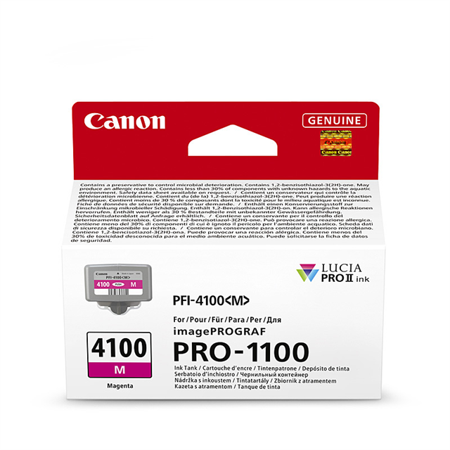 The Canon PFI-4100 Magenta (M) ink tank contains 80mL of genuine LUCIA PRO II pigment ink, exclusively designed for the Canon imagePROGRAF PRO-1100 printer