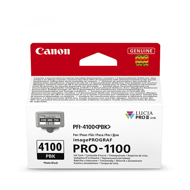 The Canon PFI-4100 Photo Black (PBK) ink tank contains 80mL of genuine LUCIA PRO II pigment ink, exclusively designed for the Canon imagePROGRAF PRO-1100 printer