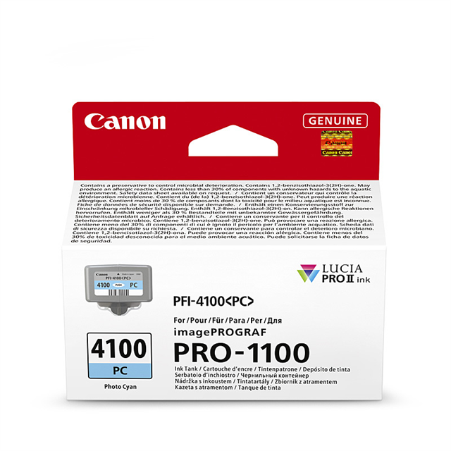 The Canon PFI-4100 Photo Cyan (PC) ink tank contains 80mL of genuine LUCIA PRO II pigment ink, specifically formulated for the Canon imagePROGRAF PRO-1100 printer