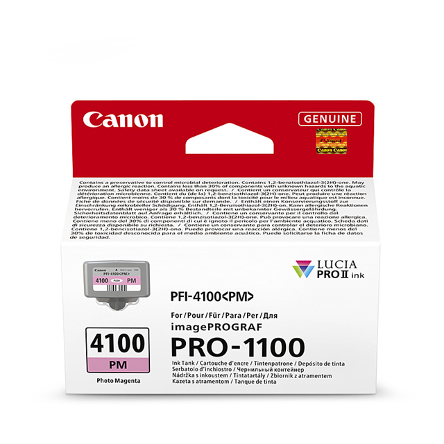 The Canon PFI-4100 Photo Magenta (PM) ink tank contains 80mL of genuine LUCIA PRO II pigment ink, designed for professional use with the Canon imagePROGRAF PRO-1100 printer