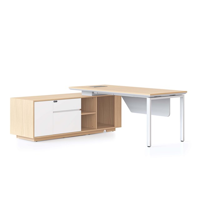 Casa Executive Desk With Profile End Leg *LEFT* Hand Side Configuration - Natural Oak / White Satin 2000mm W x 1800mm x 600mm - 748mm H Desk: 1800mm x 800mm D x 748mm H Side Cabinet: 1800mm W x 600mm D x 620mm H Table Top Thickness: 43mm Modesty Panel Height: 350mm Shark Nose Edge Profile To Table Top Natural Oak Worksurface With Natural White Profiles + In Desk Cable Tidy Box With Brush Trip Dualway Lid 2 x Lockable Drawers Fitted With Cyberlock 4 Digit Combination Lock And Soft Close Runners 1 x Swing Door Cupboard With Adjustable Shelf With Soft Close Hinges 1 x Open Shelf Compartment With 1 Adjustable Shelf Natural Oak Carcass With Natural White Drawer And Door Fronts Profile End Leg Finished In White Satin P/C 750mm W - 60mm x 30mm Profile White Satin P/C Finish 2mm Gauge Steel Construction 5 Year Warranty * Note: Left Hand Configuration Means, When The User Is Sitting At The Desk, The Cabinet Is To Their Left Hand Side *