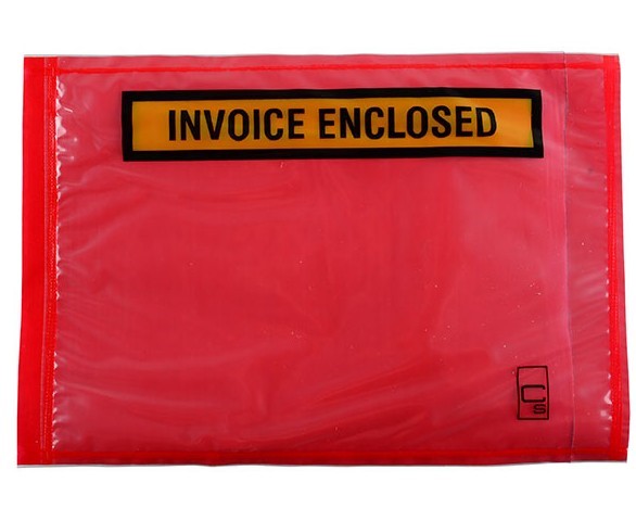 • Larger size for multiple documents • Yellow and Black print "Invoice Enclosed" • Red background • Top Layer 45MIC, Bottom layer 35MIC, Release paper 60gsm, Adhesive 19-21gsm