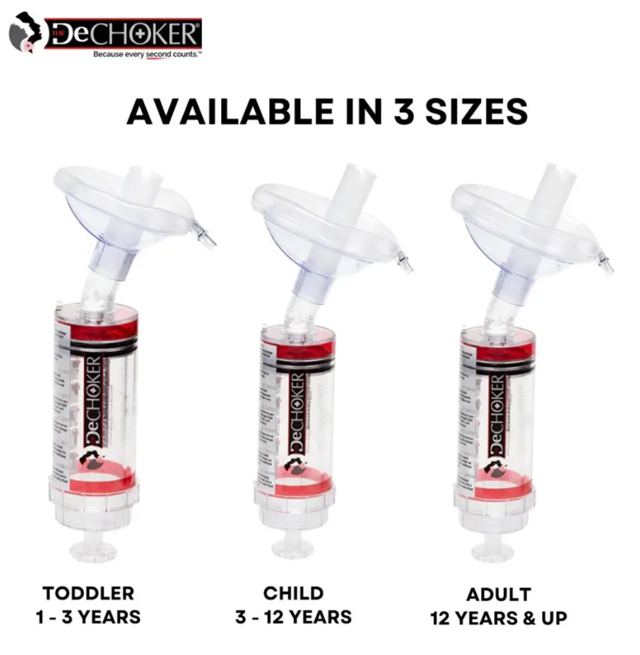 The Dechoker is available in three sizes: Toddler (1-3 years), Child (3-12 years), and Adult (12 years and up), ensuring suitability for a wide range of users