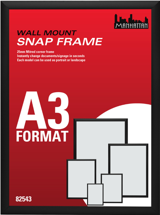 Deliver clear communication with a refined modern edge using the Manhattan Wall Mounted Standard Snap Frame Black A3