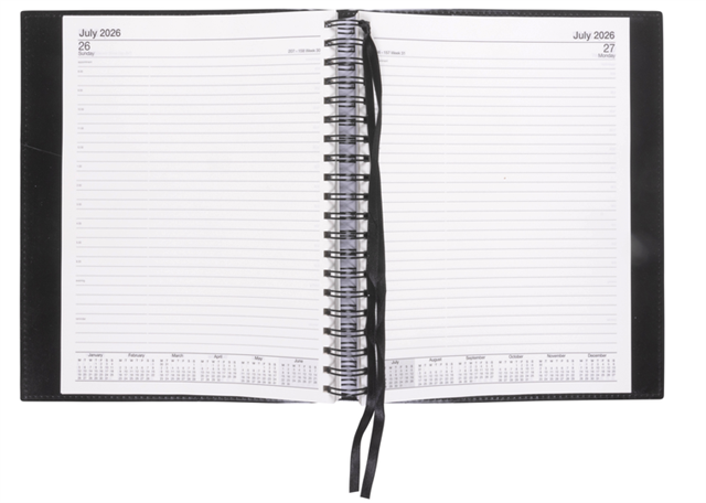 The Cumberland Norwich Quarto Diary 2026 is a spiral-bound, black, day to a page diary for the year 2026, featuring a durable leather-grain or PVC cover