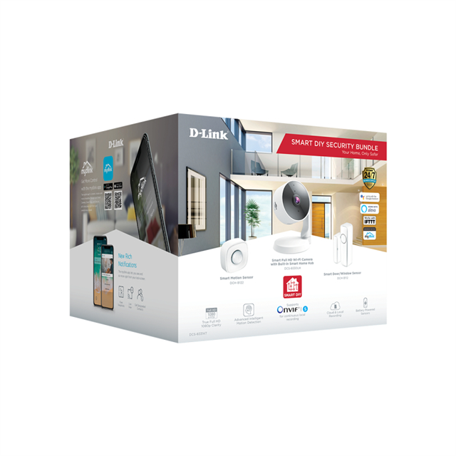 The Smart DIY Security Kit includes a Smart Full HD Wi-Fi Camera (DCS-8330LH), Smart Door/ Window Sensor (DCH-B112) and Smart Motion Sensor (DCH-B122)