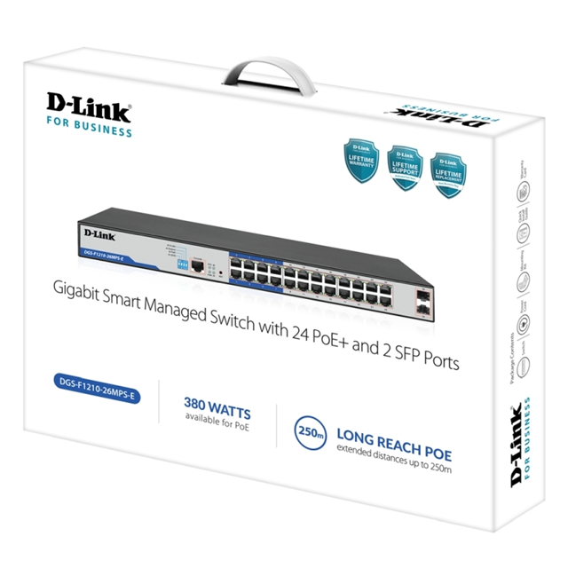 D-Link DGS-F1210-26MPS-E Switch, 26-Port Gigabit WebSmart PoE+ Switch with 24 PoE+ ports (8 with Long Reach PoE) and 2 SFP Ports