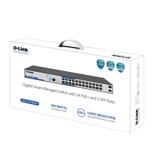 D-Link DGS-F1210-26PS-E Switch, 26-Port Gigabit WebSmart PoE+ Switch with 24 PoE+ ports (8 with Long Reach PoE) and 2 SFP Ports