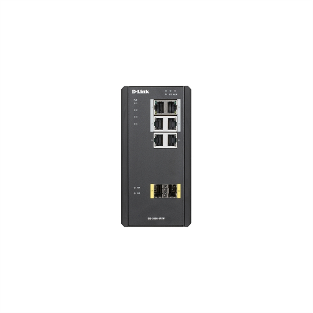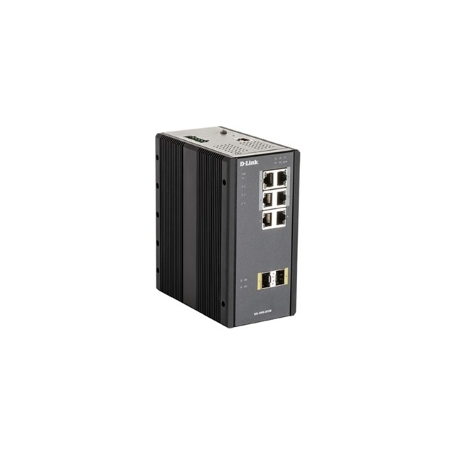 8-Port Gigabit Industrial Managed PoE Switch with 6 1000BASE-T ports (4 PoE+) and 2 SFP ports, operating temp up to 75 degrees, DIN Rail mountable
