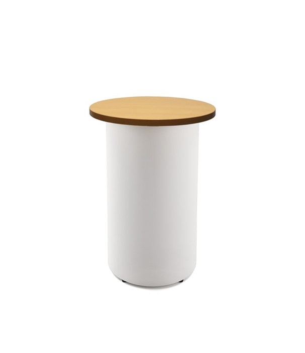 Drum Base Round High Bar Table - Beech/White 600mm Dia x 1050mm H 25mm T Beech Table Top With Matching Edge Tape Drum Base Finished In White P/C Underframe Dimensions: 450mm Dia x 1025mm H Adjustable Leveling Feet E0 Enviroboard 5 Year Warranty