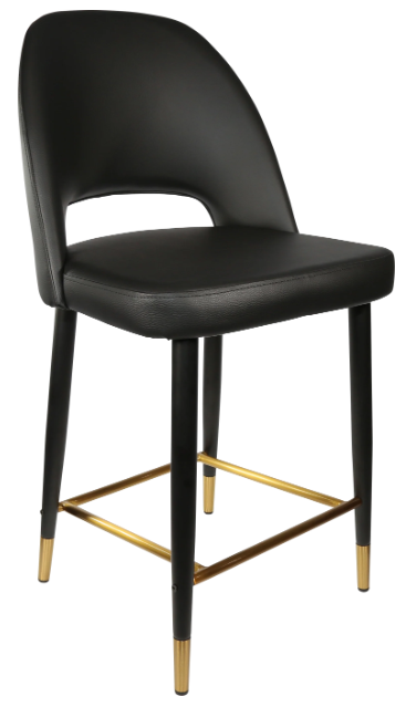 Made in Europe Brand: Durafurn 38mm steel tube with tapered leg Matt black powder coat with stainless steel, gold flec foot ring High quality foam & vinyl SWL:150kg 3-year warranty Stocked in (upholstery): Anthracite, Black & Taupe Vinyl - Anthracite, Light Grey & Navy Woven Fabric - Tan, Mocha & Charcoal Premium Vinyl - Avocado & Denim Velvet Stocked in (leg frame): Black Metal Legs with gold tips and footrail Suitable for indoor commercial application Dimensions: 1040H x 520W 580D x 680 Seat Height Extensive selection of frame & upholstery choices available for custom orders Supplied unassembled