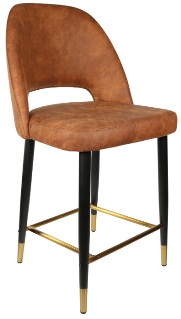 Made in Europe Brand: Durafurn 38mm steel tube with tapered leg Matt black powder coat with stainless steel, gold flec foot ring High quality foam & vinyl SWL:150kg 3-year warranty Stocked in (upholstery): Anthracite, Black & Taupe Vinyl - Anthracite, Light Grey & Navy Woven Fabric - Tan, Mocha & Charcoal Premium Vinyl - Avocado & Denim Velvet Stocked in (leg frame): Black Metal Legs with gold tips and footrail Suitable for indoor commercial application Dimensions: 1040H x 520W 580D x 680 Seat Height Extensive selection of frame & upholstery choices available for custom orders Supplied unassembled
