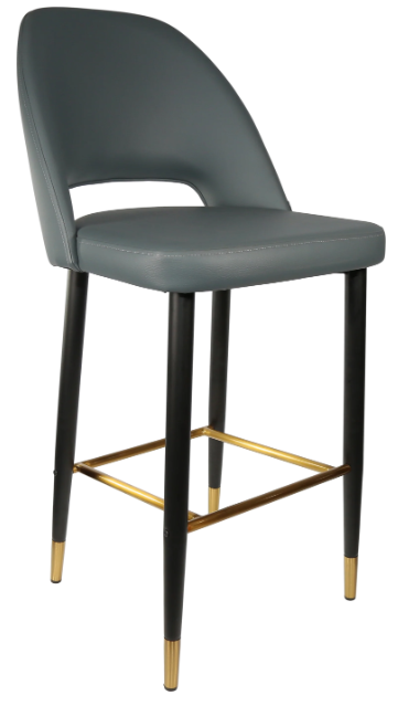 Made in Europe Brand: Durafurn 38mm steel tube with tapered leg Matt black powder coat with stainless steel, gold flec foot ring High quality foam & vinyl SWL:150kg 3-year warranty Stocked in (upholstery): Anthracite, Black & Taupe Vinyl - Anthracite, Light Grey & Navy Woven Fabric - Tan, Mocha & Charcoal Premium Vinyl - Avocado & Denim Velvet Stocked in (leg frame): Black Metal Legs with gold tips and footrail Suitable for indoor commercial application Dimensions: 1140H x 520W 580D x 780 Seat Height Extensive selection of frame & upholstery choices available for custom orders Supplied unassembled