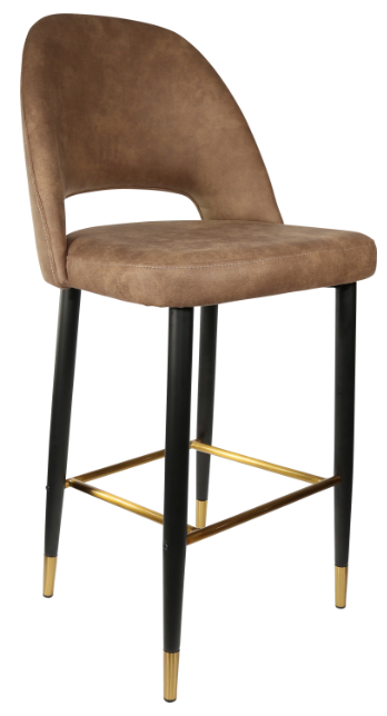 Made in Europe Brand: Durafurn 38mm steel tube with tapered leg Matt black powder coat with stainless steel, gold flec foot ring High quality foam & vinyl SWL:150kg 3-year warranty Stocked in (upholstery): Anthracite, Black & Taupe Vinyl - Anthracite, Light Grey & Navy Woven Fabric - Tan, Mocha & Charcoal Premium Vinyl - Avocado & Denim Velvet Stocked in (leg frame): Black Metal Legs with gold tips and footrail Suitable for indoor commercial application Dimensions: 1140H x 520W 580D x 780 Seat Height Extensive selection of frame & upholstery choices available for custom orders Supplied unassembled