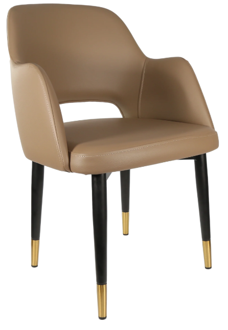 Made in Europe Brand: Durafurn 38mm steel tube with tapered leg Matt black powder coat with stainless steel, gold flec foot ring High quality foam & vinyl SWL:150kg 3-year warranty Stocked in (upholstery): Anthracite, Black & Taupe Vinyl - Anthracite, Light Grey & Navy Woven Fabric - Tan, Mocha & Charcoal Premium Vinyl - Avocado & Denim Velvet Stocked in (leg frame): Black Metal Legs with gold tips and footrail Suitable for indoor commercial application Dimensions: 820H x 570W 600D x 460 Seat Height Extensive selection of frame & upholstery choices available for custom orders Supplied unassembled